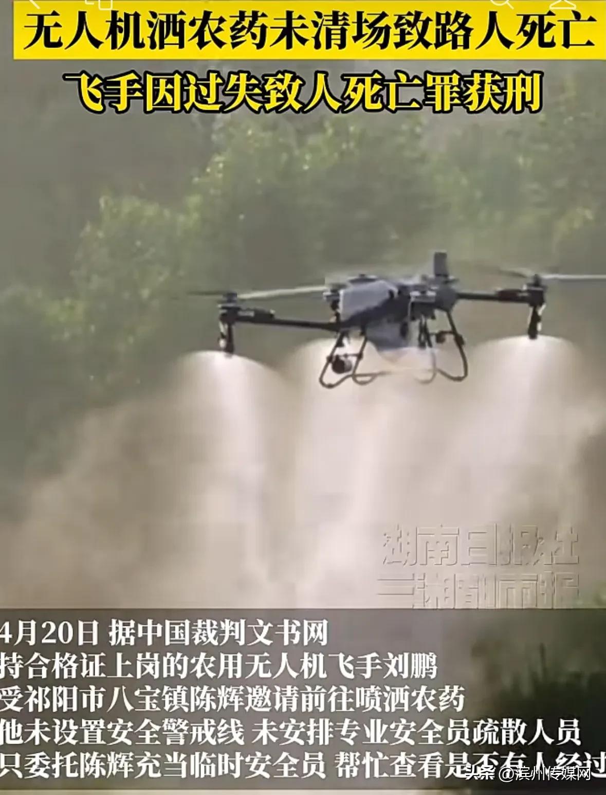 喷洒农药、播撒种子、施肥,无人机已广泛运用到农业生产各个方面,但新技术的使用必须严格遵守安全规范。近日,中国裁判文书网公布了一起农用无人机作业致人死亡案的判决书,涉案飞手刘鹏(化名)因过失致人死亡罪被永州祁阳市人民法院判刑。